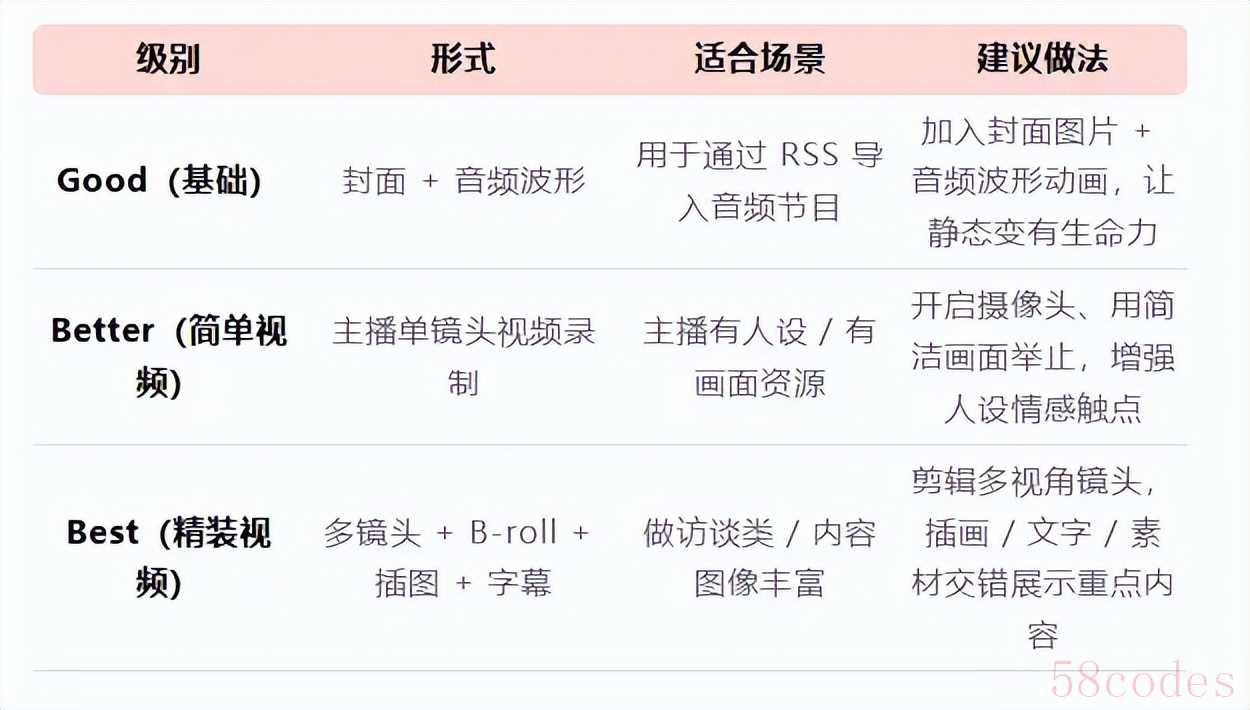 音频始终是播客内容的根源,但在油管上你还得加“视听包装”。官方推荐了一种视效渐进模型:静态画面 → 简单视频 → 精装多镜头。