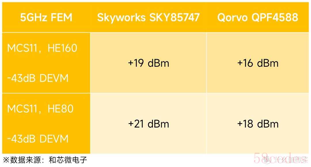 而FEM的工作频宽越大,对应的放大功率就会变小。比如上面 Skyworks 和 Qorvo 的两颗FEM。保持其他参数不变,频宽从160MHz下调到80MHz,输出功率就增加了2dBm。这也就是收窄频宽增强信号的依据。