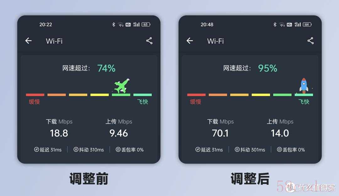 经过频宽设为80MHz、锁定36信道、调整摆位等一顿操作之后,网速从原本的不到20兆,增加到了70兆,提升足足273%!
