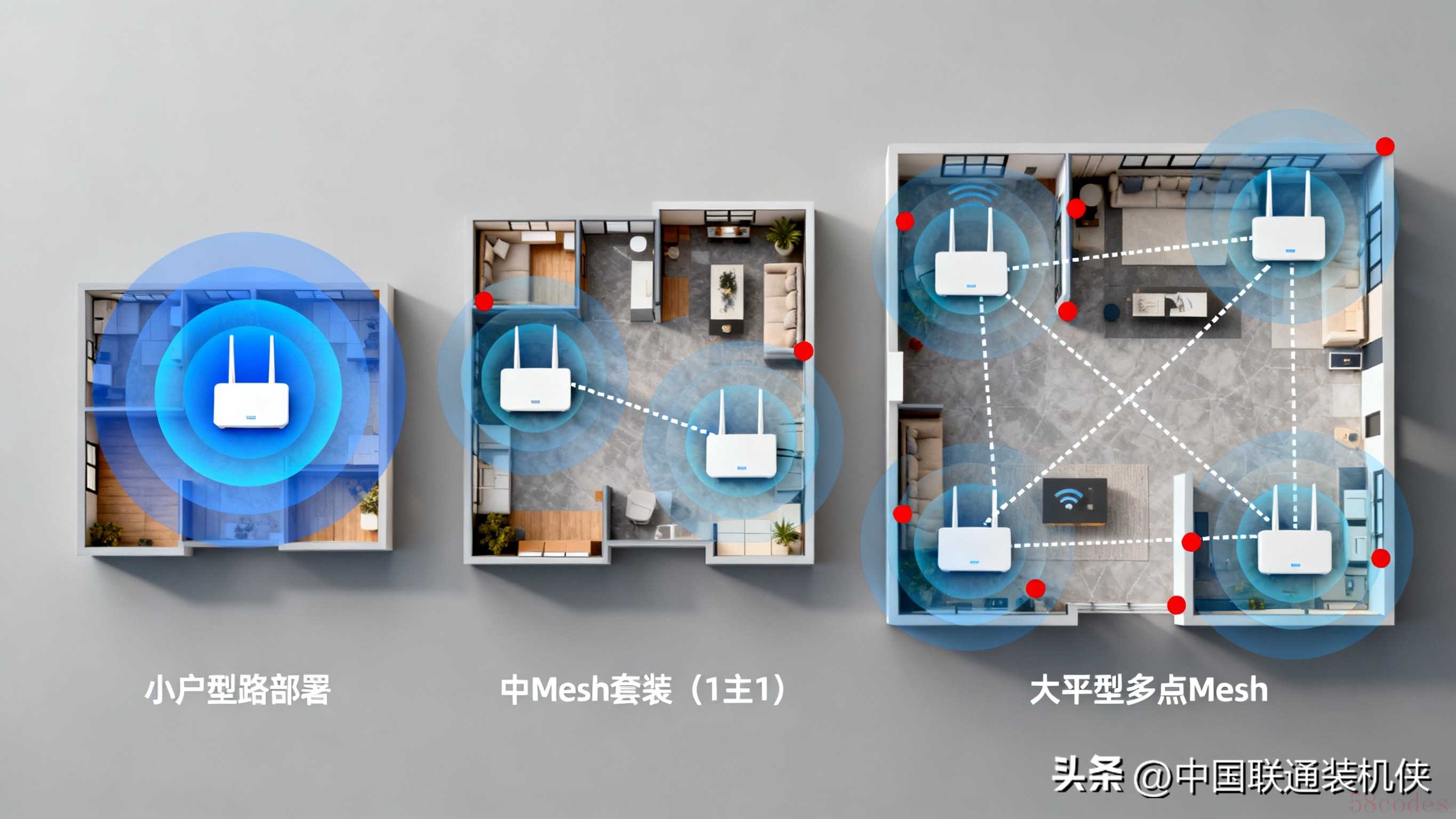 大户型(>140㎡/多承重墙):WiFi 6 Mesh套装(1主2从)或入门级WiFi 7 Mesh,预算1500-3000元,装修时预留网线做有线回传,避免无线回传速率衰减。