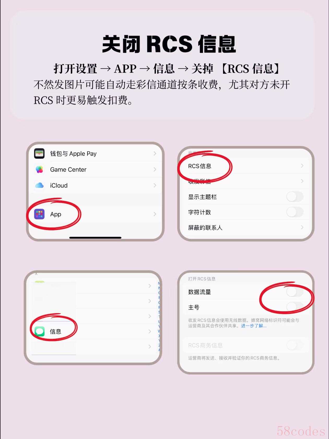 关闭步骤:设置→信息→关掉“RCS信息”,发图片用微信、QQ更稳妥,避免短信扣费。