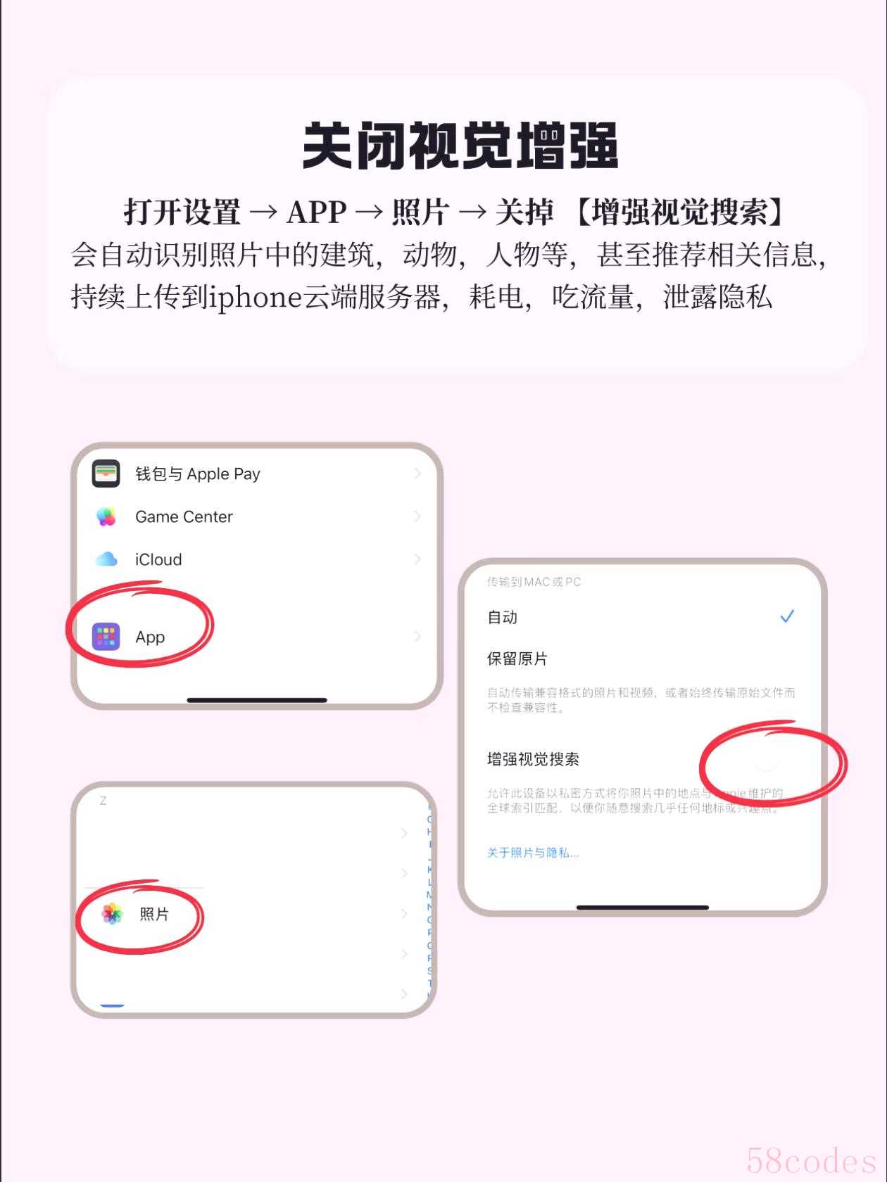 关闭步骤:设置→照片→关掉“增强视觉搜索”,照片只存在本地,安全又省流量。