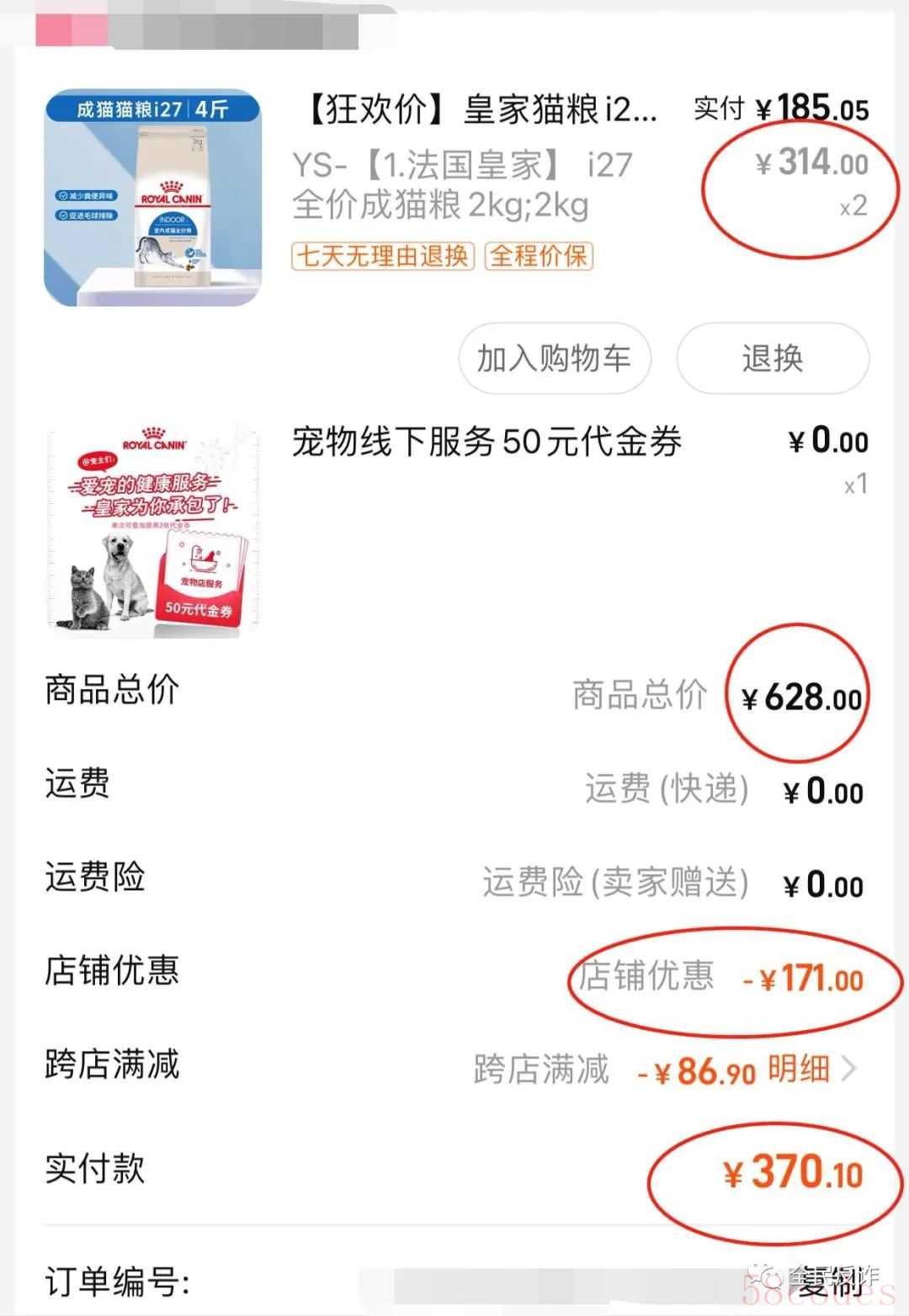 “双十一”,网购平台活动是满300-50,当时因为给老人买羽绒衣,凑单的时候,想到买猫粮,就在网上找到了某宠物旗舰店,页面上显示,该款猫粮原价是314元一袋,双十一活动,93元一袋。该款猫粮平时市场价,在网购平台自己的超市平时在90-96元左右之间,昨天纯粹是为了凑单,选了两袋。该商品当时结算页面显示是185元,相当于是92.5元一袋。