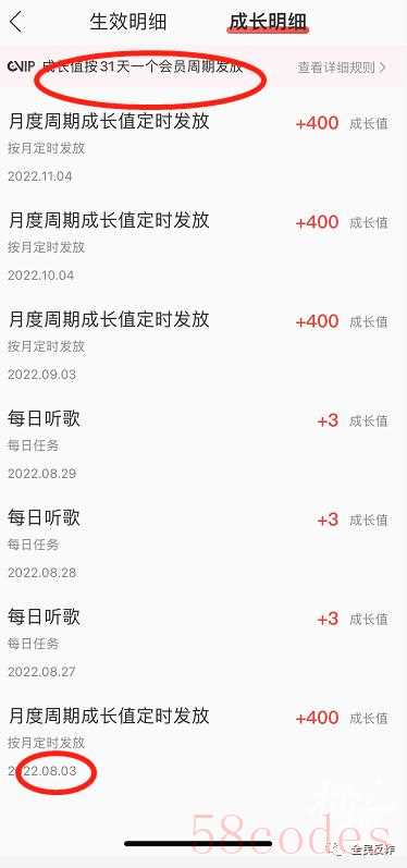 随后,我再查看这个黑胶会员成长明细,明细中并没有扣费购买记录。按规则,是31天为一个周期,非自然月发放,但记录显示是从8月3日开始计算分值的。而扣费记录显示会员费用是从5月27日开始,退一步说,即便5月为首月的试用月,不算在内,6月是正常收费月,31天为一个周期,计算期间也该从7月开始。