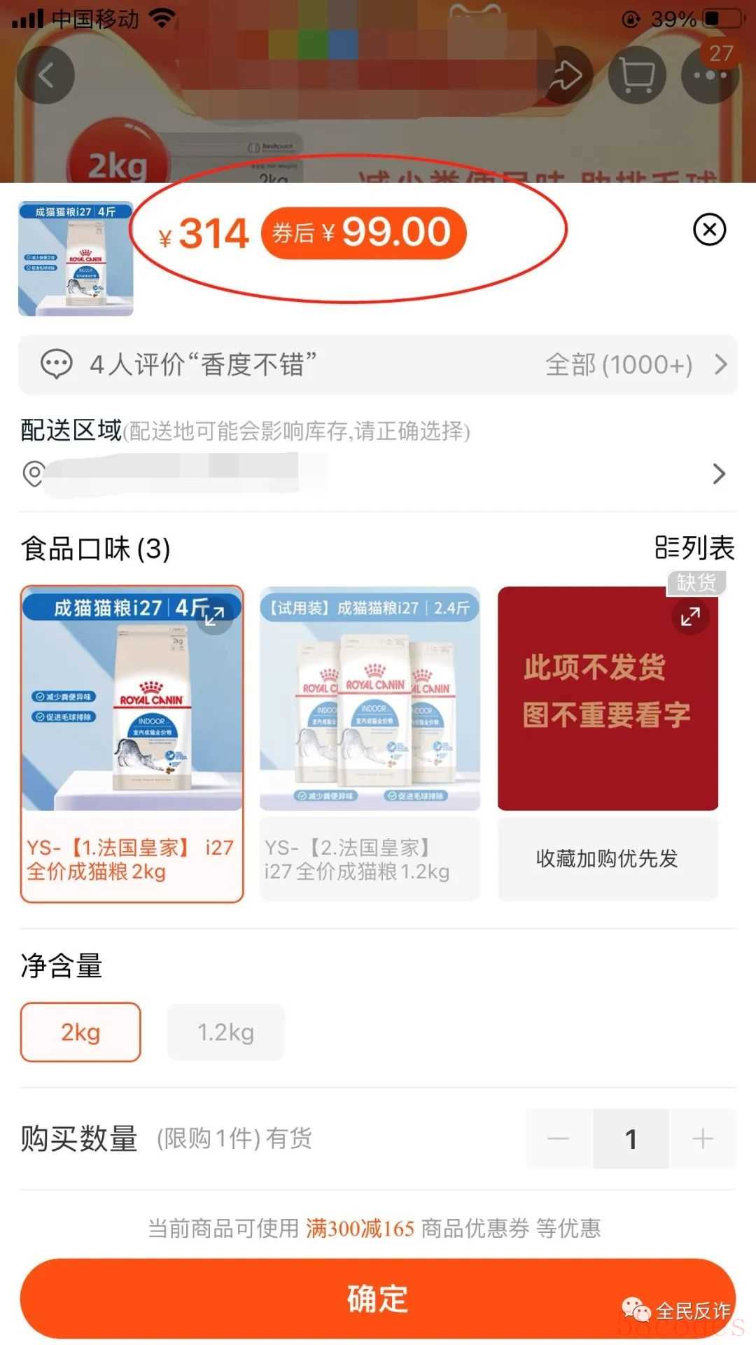 下面截图是今天商品页面,变成99元一袋,但原价依然是314元。价格每天一个价不去说,按这个商家的游戏规则,满300-165元,只能减一次,也就是说,你买1件减165,买10件也是减165!