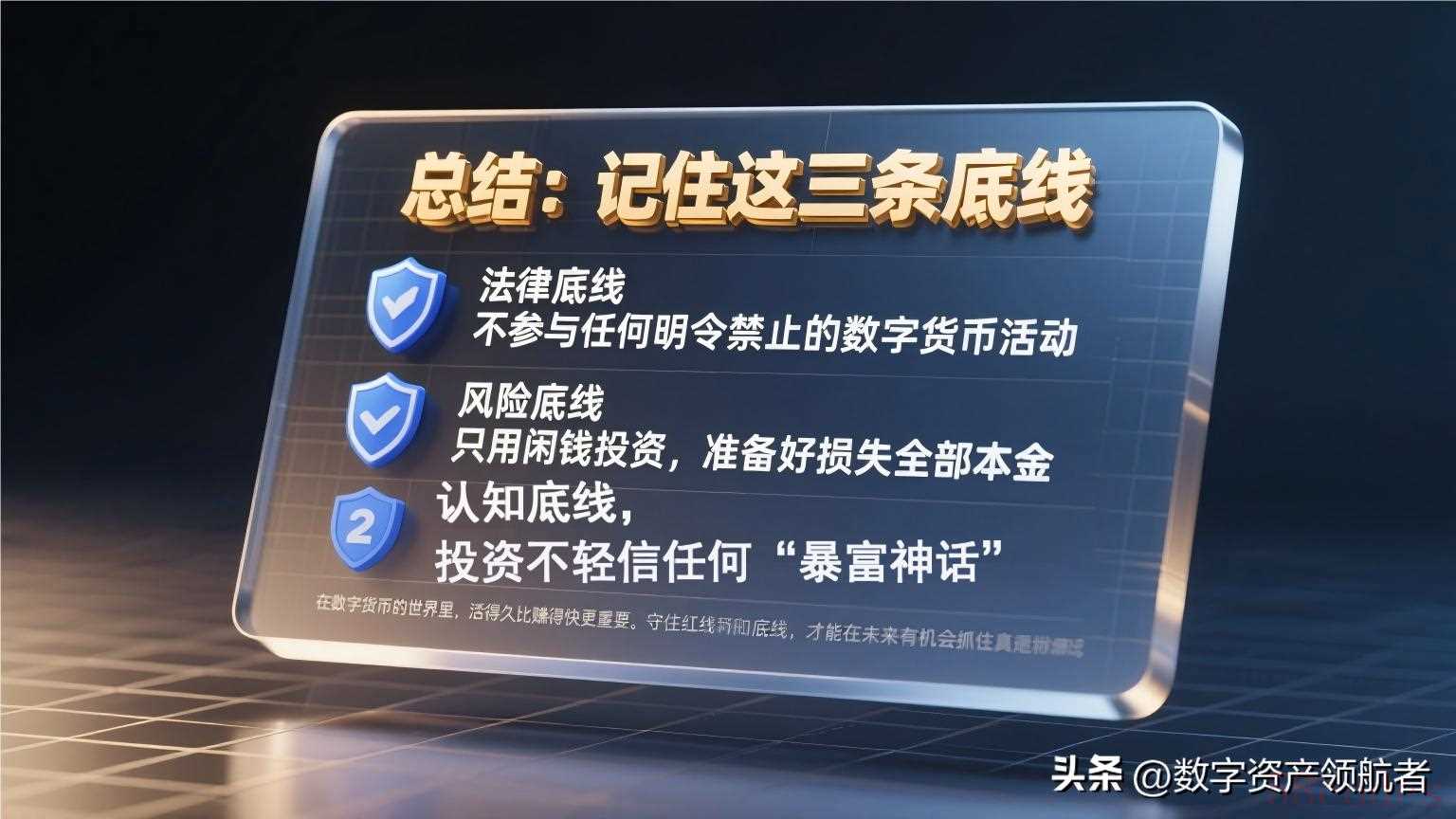 1.法律底线:不参与任何明令禁止的数字货币活动2.风险底线:只用闲钱投资,准备好损失全部本金3.认知底线:不懂不投,不轻信任何"暴富神话"在数字货币的世界里,活得久比赚得快更重要。守住红线和底线,才能在未来有机会抓住真正的机遇。