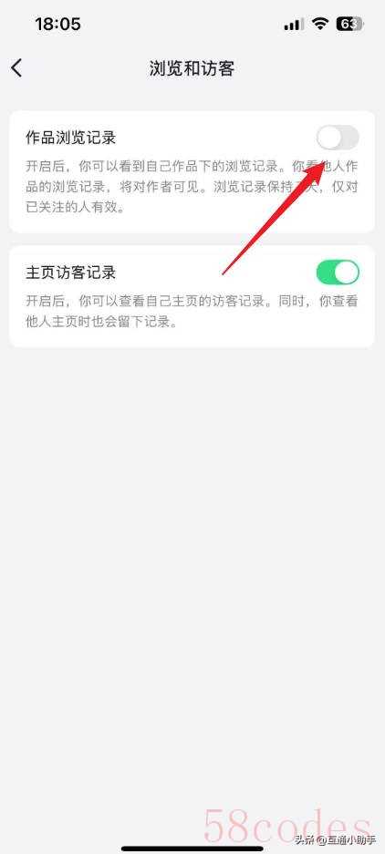 5、进入到浏览和访客页面,点击“作品浏览记录”右侧按钮关闭。