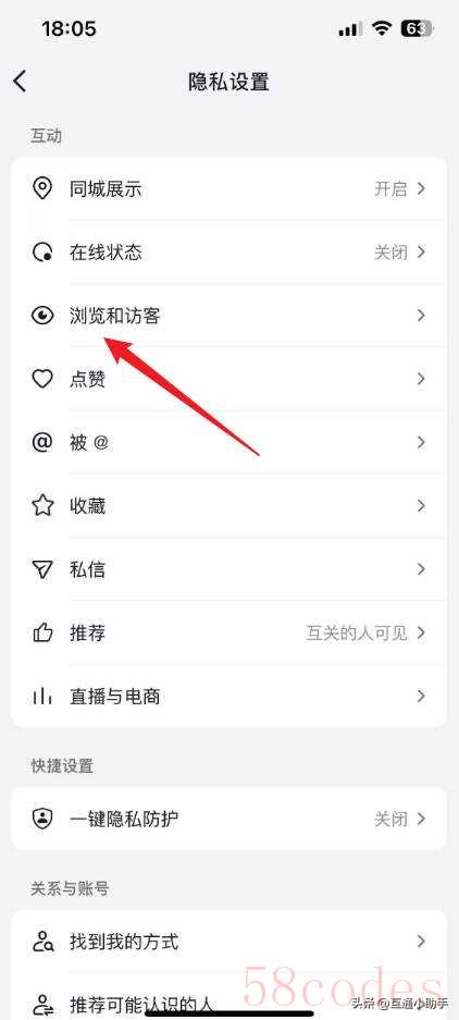 4、进入到隐私设置页面,点击“浏览和访客”。