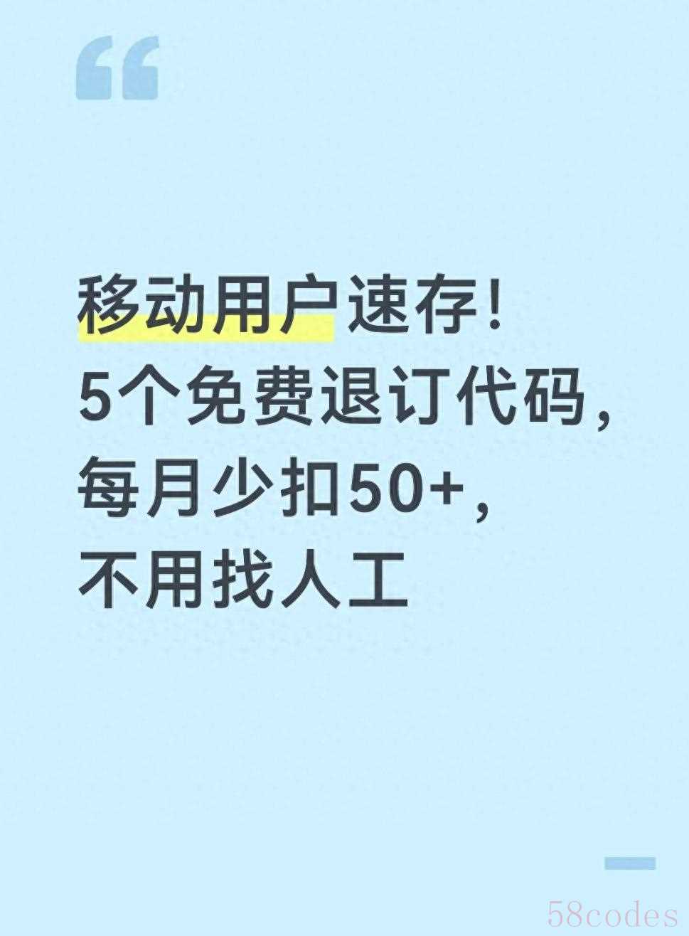 您好!您提到的“移动用户速存!5个免费退订代码每月少扣50 ,不用找人工”的信息,听起来像是某种优惠或福利信息,但需要提醒您的是,移动运营商通常不会通过发送短信或网络信息的方式告知用户可以通过“退订代码”来减少月费。