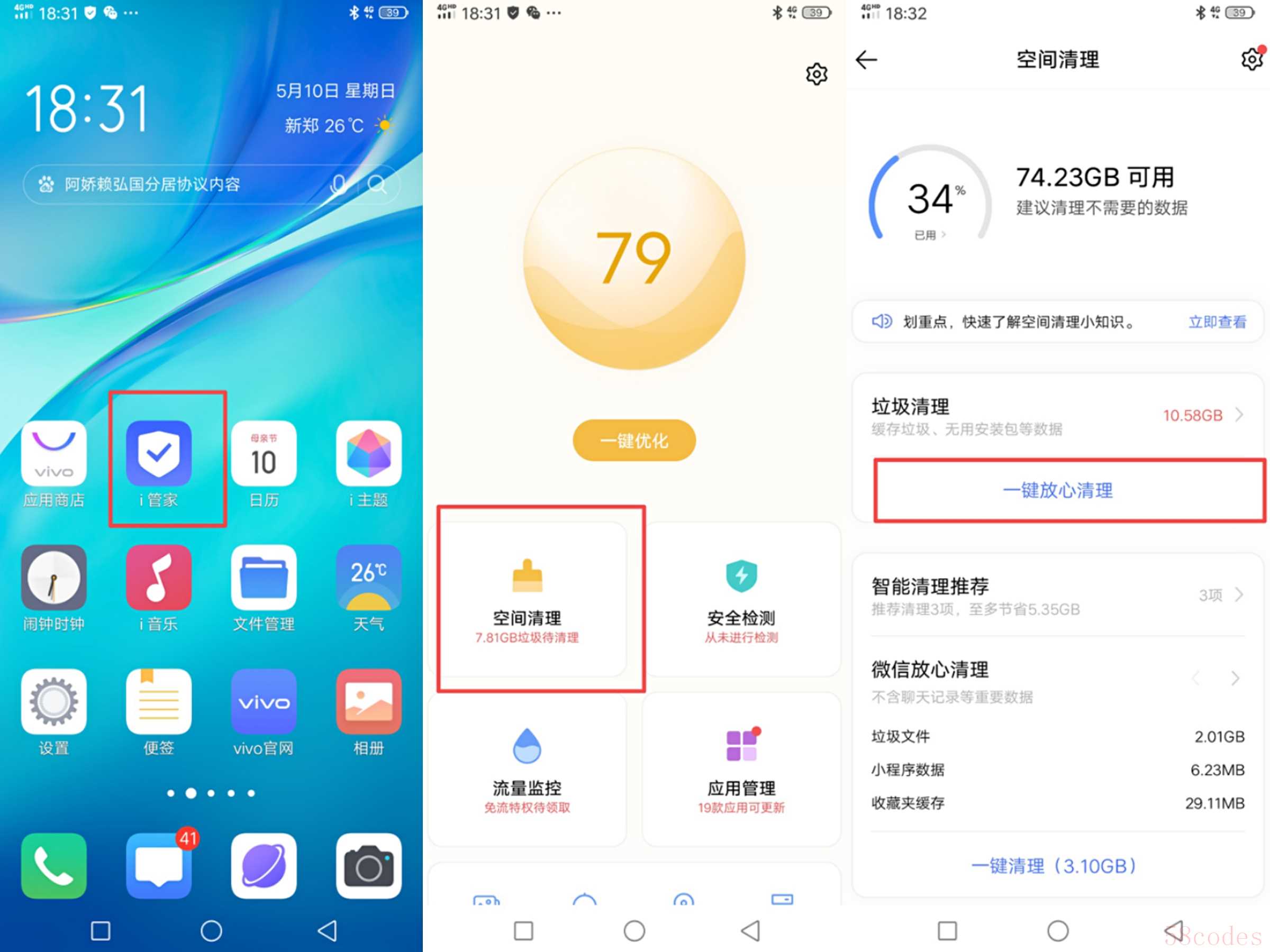 打开i管家APP,点击手机清理,这个时候i管家就会对手机中的缓存、系统缓存、卸载残留等进行扫描,扫描完之后,点击下方的一键清理,这样就可以清理一部分垃圾,然后我们点击返回,回到主界面