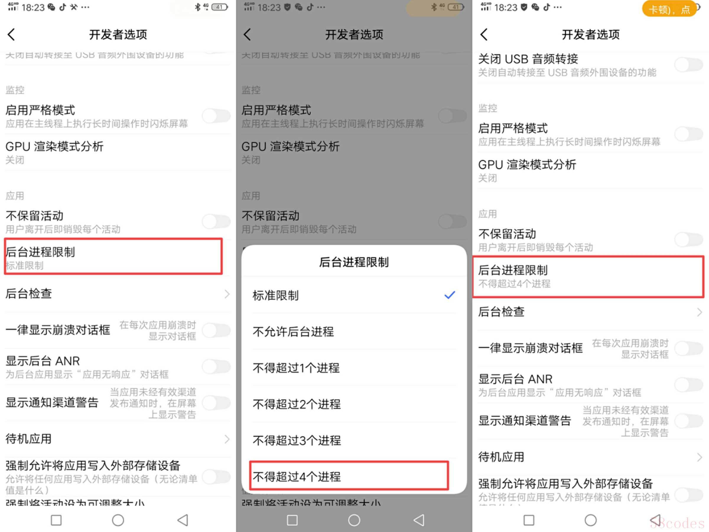 接着我们往下拉,找到后台进程限制,点开它,设置成不得超过4个进程,这样就可以限制vivo手机的后台进程了,进而提升vivo手机的流畅度。