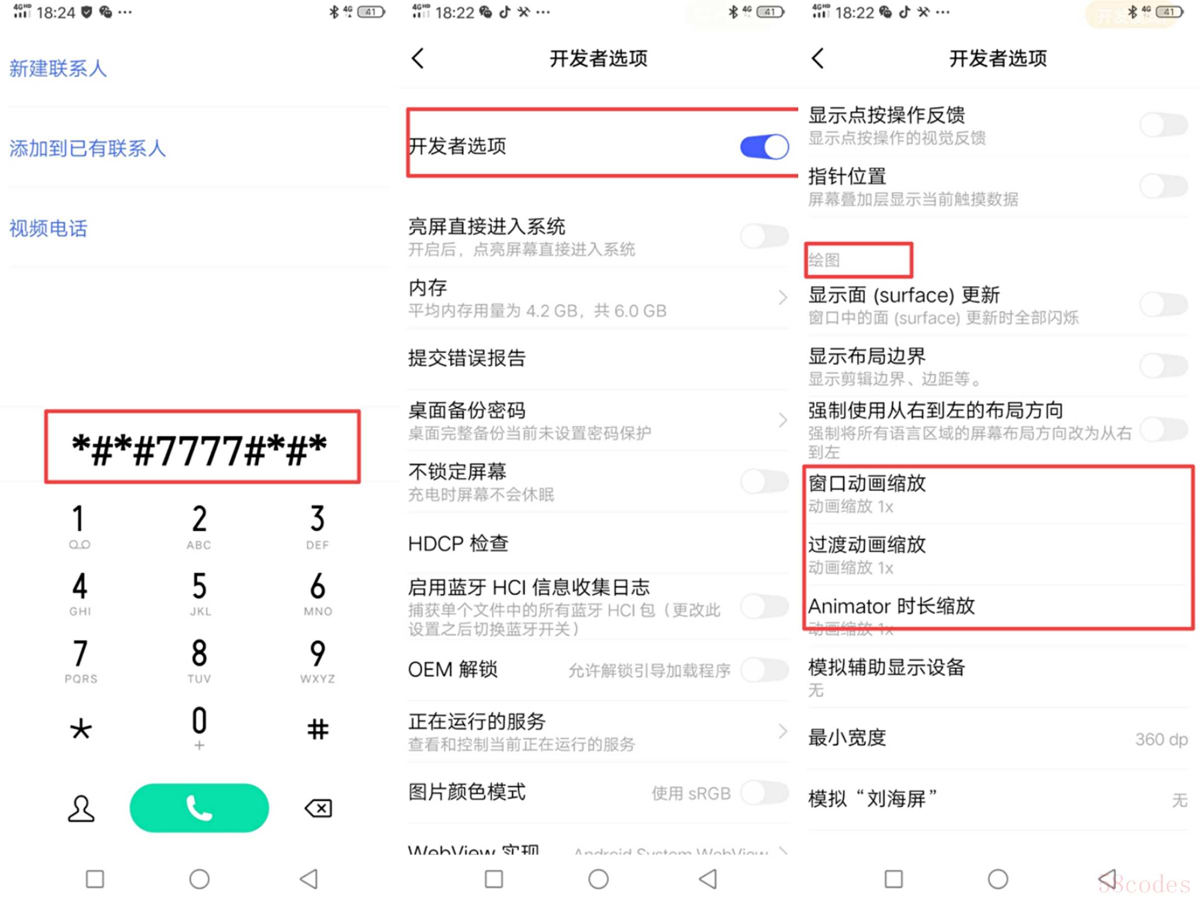 在手机拨号键输入*#*#7777#*#*,就会自动跳入一个界面,如上图所示,打开,开发者选项按钮,然后往下面拉,找到绘图栏目,下方有三个选项按钮,分别为: 窗口运动缩放,过渡动画缩放,Animator窗口缩放。