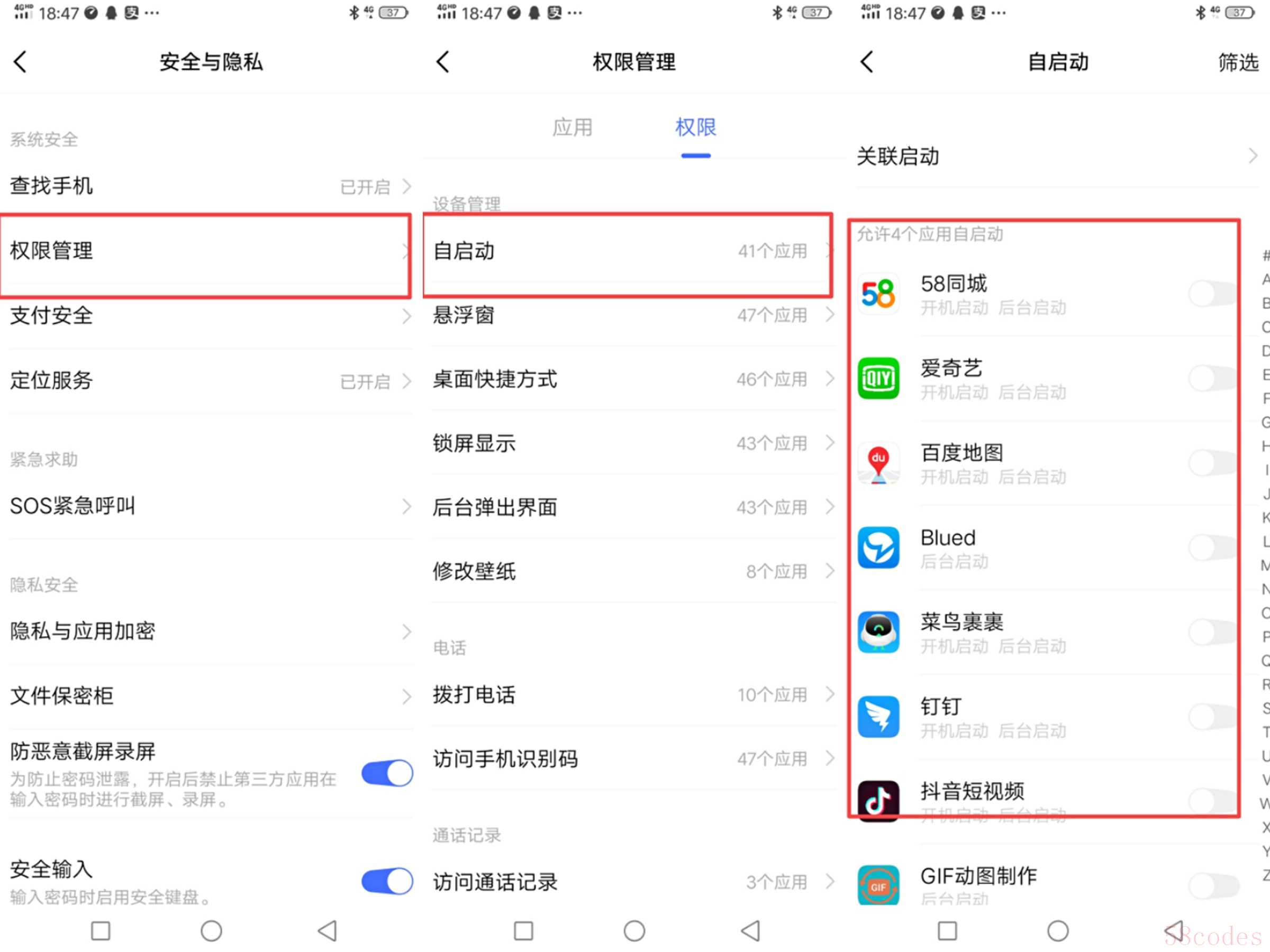 点击权限管理,点击权限,再点击自启动,关闭用不到的自启动软件,避免不需要的软件在后台运行,占运行空间。