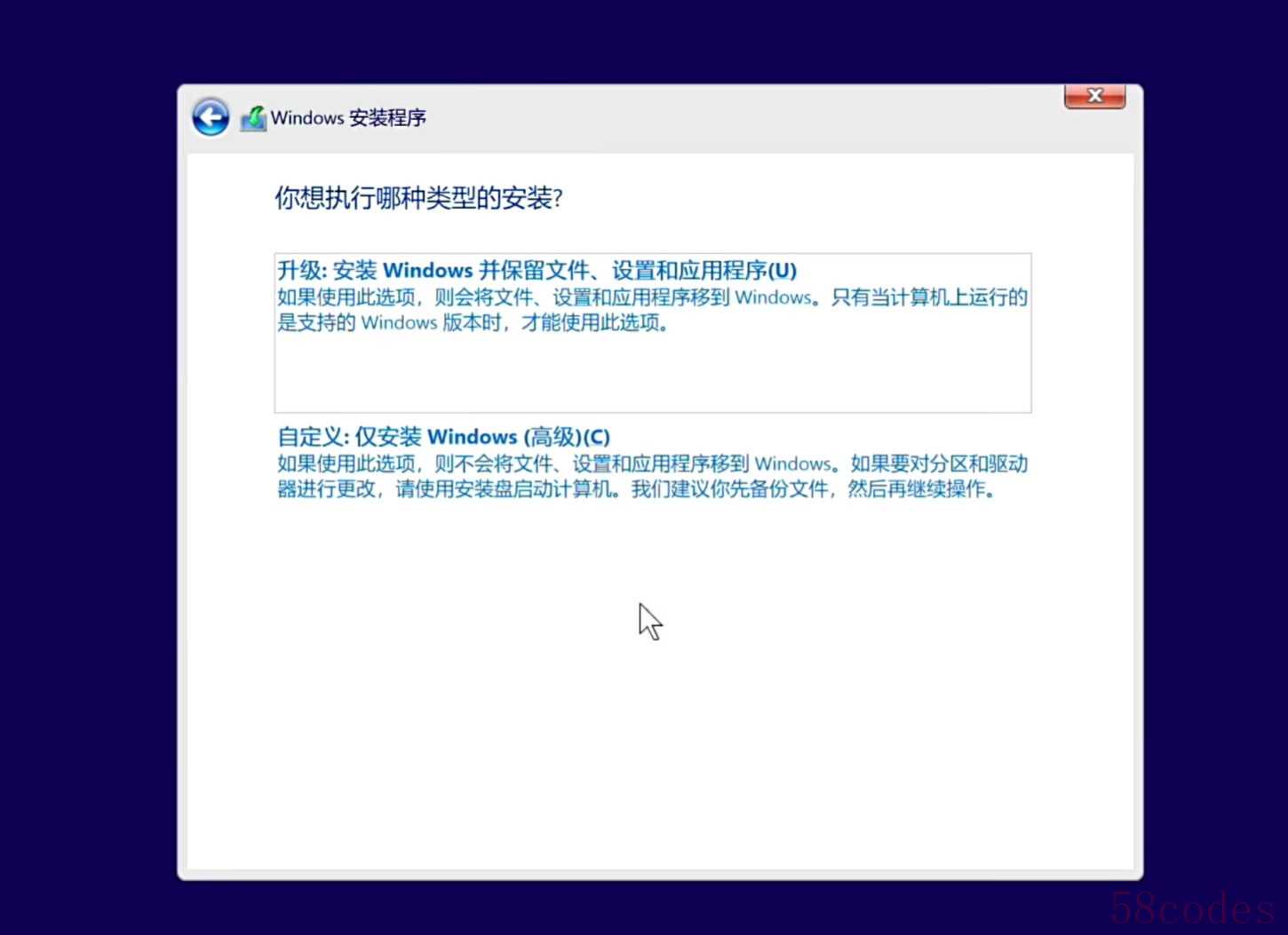 - 选择安装类型(通常选择“自定义:仅安装Windows(高级)”)。