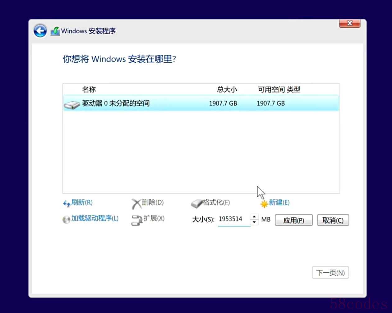 接下来就是将Windows系统安装在哪个硬盘上,界面会列举电脑中已经存在的硬盘,一个硬盘可能有多个分区,只要写着驱动器+数字,数字一样的,就是同一个硬盘。如果硬盘上没有必要的数据,建议选中后点删除,这样分区就不存在的,同一个硬盘会显示为1个未分配的空间。选择点击新建,会自动进行分区,之后直接点击应用即可。新硬盘会直接显示1个未分配的空间,操作同上。
