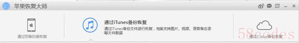 在电脑上安装苹果恢复大师后(分Windows跟Mac两个版本),打开苹果恢复大师,选择【通过iTunes备份恢复】模式。