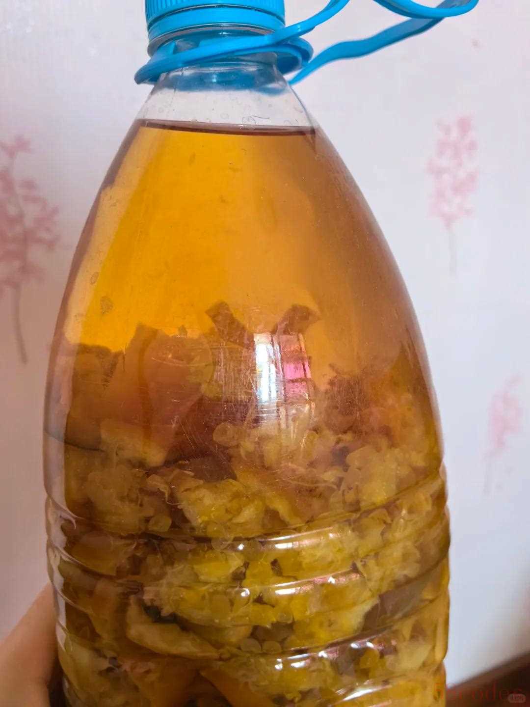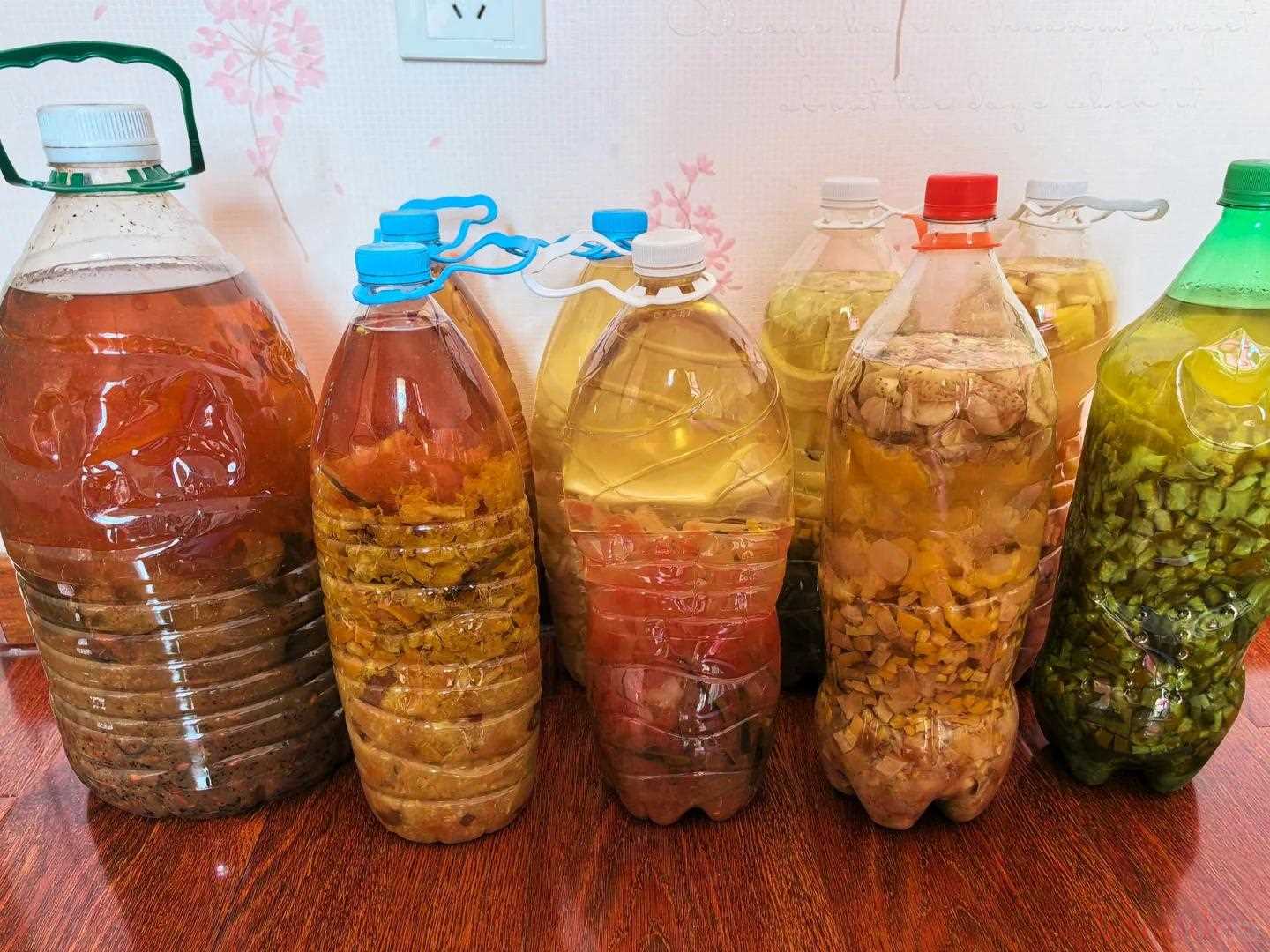 将准备好的果皮以及果肉全部放进塑料瓶当中,一般装到瓶子的1/一到三/3左右就可以了,然后再加入适量的清水或者是淘米水,开始进行发酵。