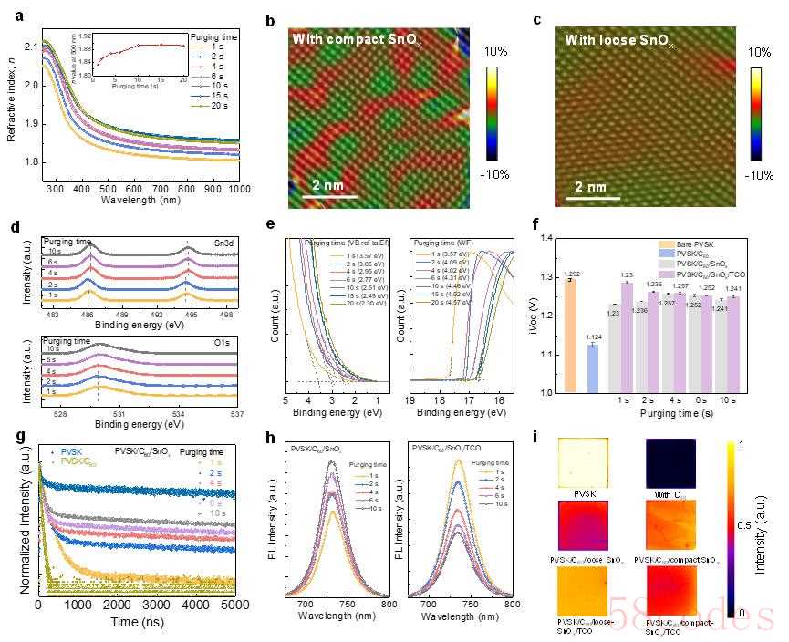 疏松SnOx层像一个微观“弹簧床垫”,在晶硅与钙钛矿之间提供缓冲空间,能在器件制备过程中吸收离子轰击带来的冲击力,也能在后续使用中为温度膨胀、机械弯折预留“活动余地”;致密SnOx层则承担起电学功能,确保界面电荷高效提取与输运,同时维持长期稳定的接触。