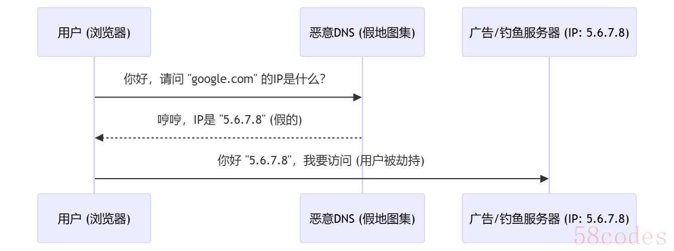 流量劫持,最常见的一种就是“DNS劫持”。恶意软件或被黑客控制的路由器,会偷偷修改你电脑或手机的“DNS设置”。