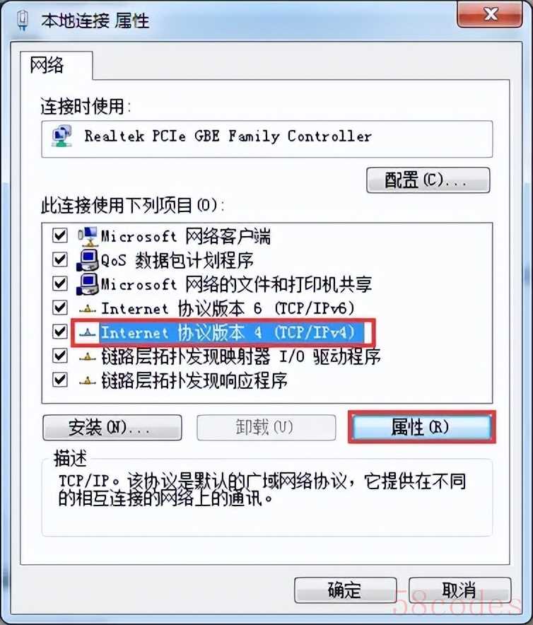 四、选择 Internet 协议版本 4(TCP/IPv4),点击 属性