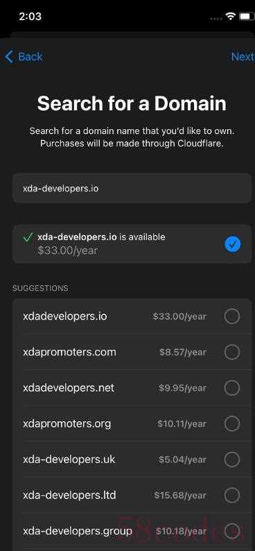 从测试截图可以看到,用户可以直接在邮件 App 中查找想要的域名,搜索栏下方会列出按年付费的相关结果,然后就可以通过 Cloudflare 服务购买域名。