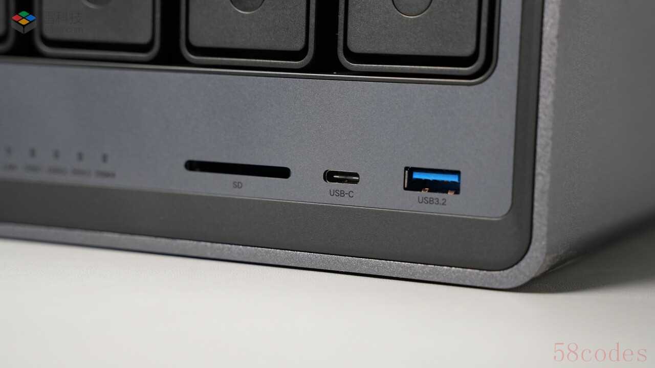接口方面,DXP4800的支持算比较丰富:网口方面搭载了两个2.5GbE接口,传输接口方面拥有USB—A 3.2 Gen2*1、USB-A 3.2Gen1*1、USB-A 2.0 480Mbps*1和USB-C Gen2 *1。这是小雷比较不满的一点,毕竟作为一台存储设备,起码要配备一个超高速的传输接口,DXP4800虽说有四个接口,但传输速度都不算高。