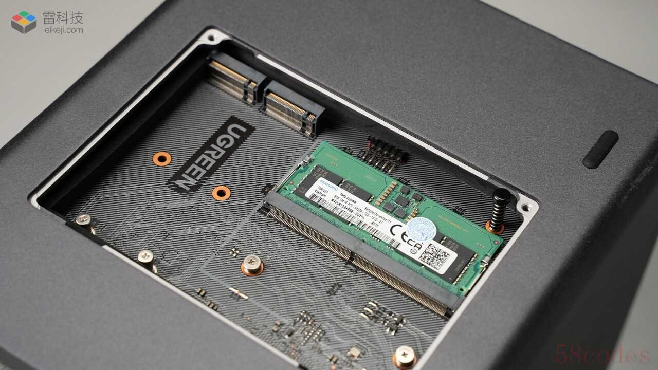 如果想加装M.2硬盘或内存条的话,则需将设备反转到底部并卸掉两颗固定螺丝,内存槽为标准协议的SO-DIMM槽,最高支持4800MHz的DDR5内存条,不过由于是单通道的关系,如果用户想要升级到16G运存,就得「安置」好原来的8G内存条。