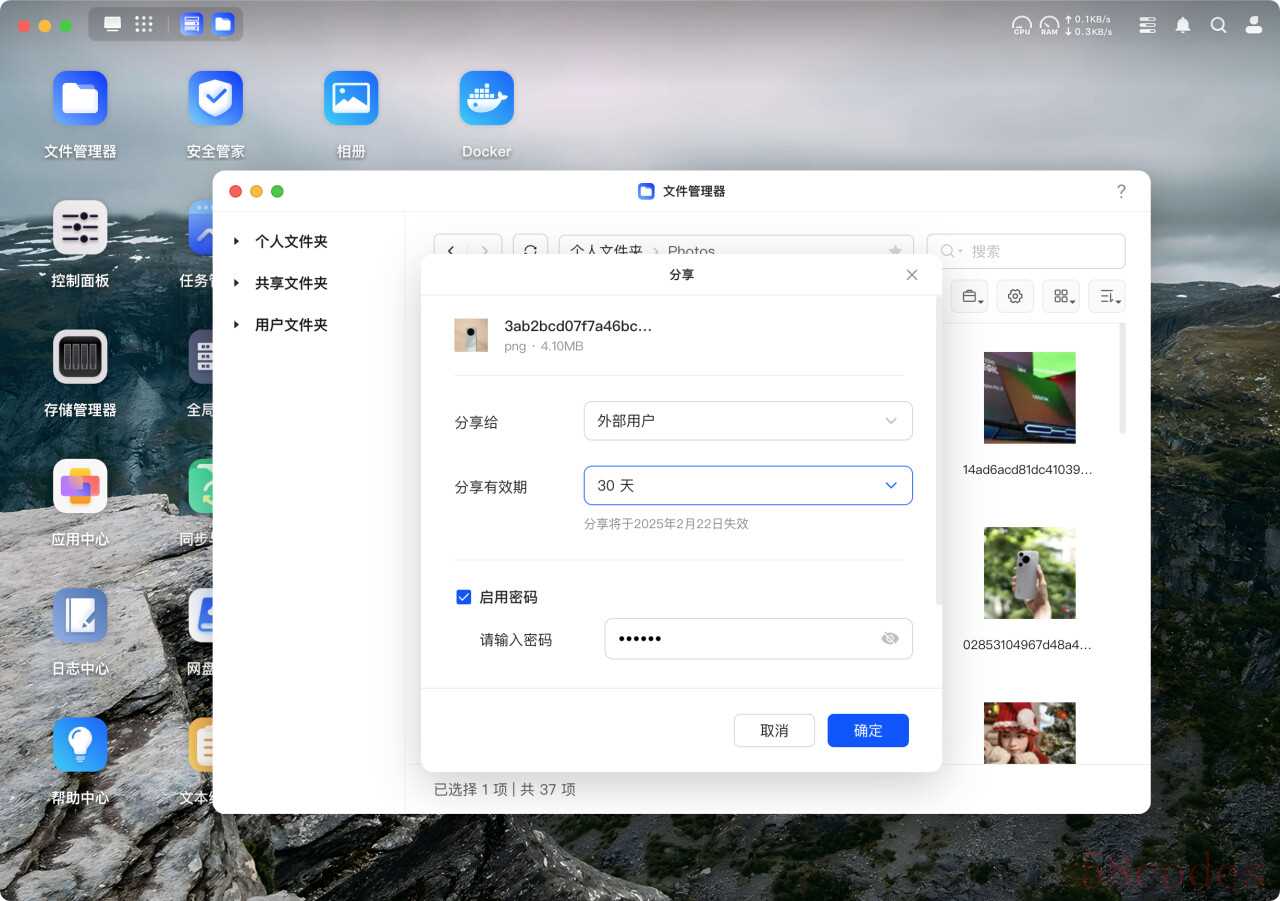 如果需要跟其他用户协作时,只需把文件上传到共享文件夹,并打开他们的读写权限即可。甚至你还可以像网盘那样生成分享链接直接丢给对方,至于有效期、访问次数和访问密码都可以自行设置。