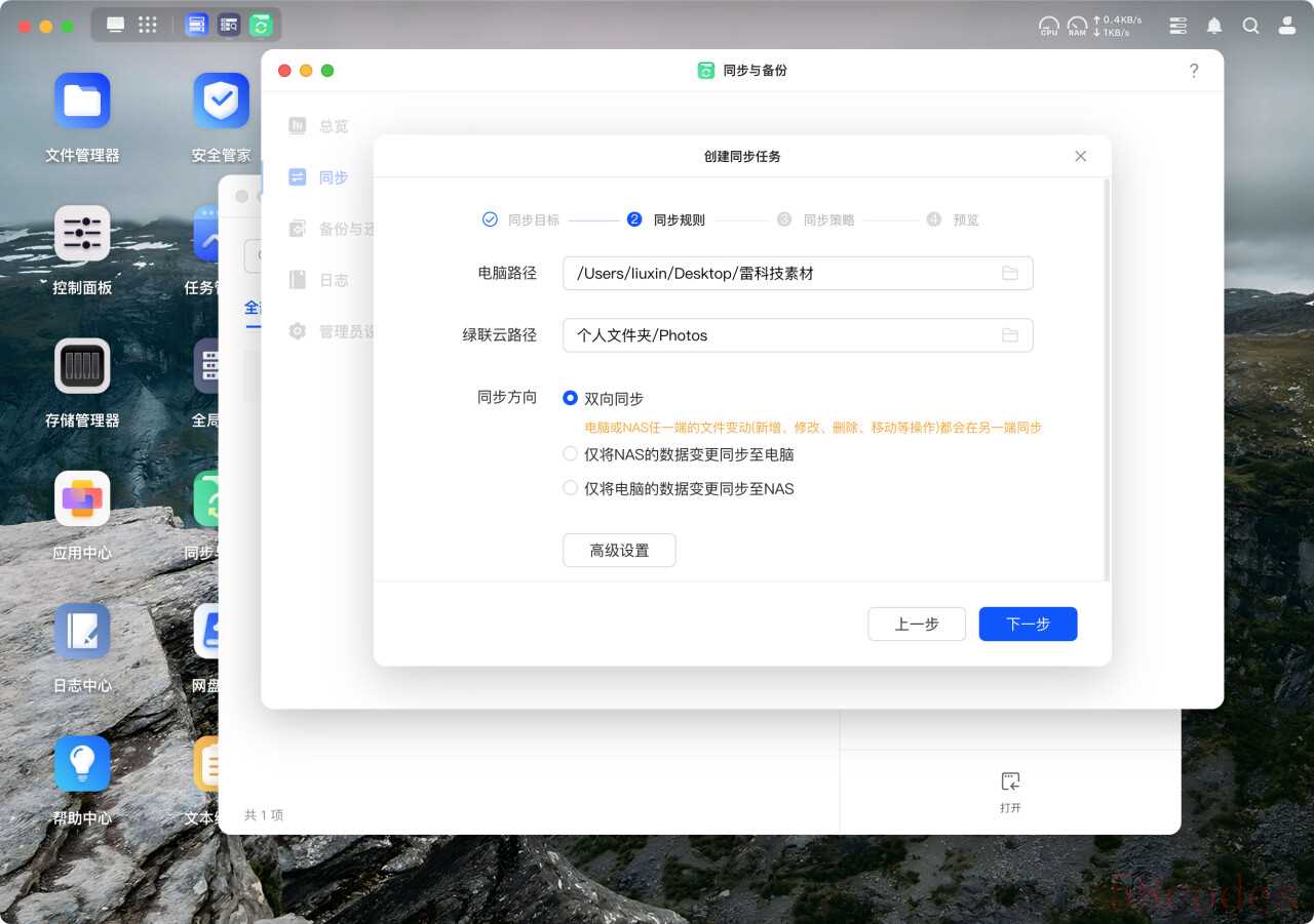 但这里有一个细节小雷必须说一下:它可以设置同步方向策略,例如仅将文件上传到DXP4800但无法下载,或是只能下载不能上传,甚至还能通过高级设置中的选项过滤掉一些不想要同步的无用文件或文件夹。