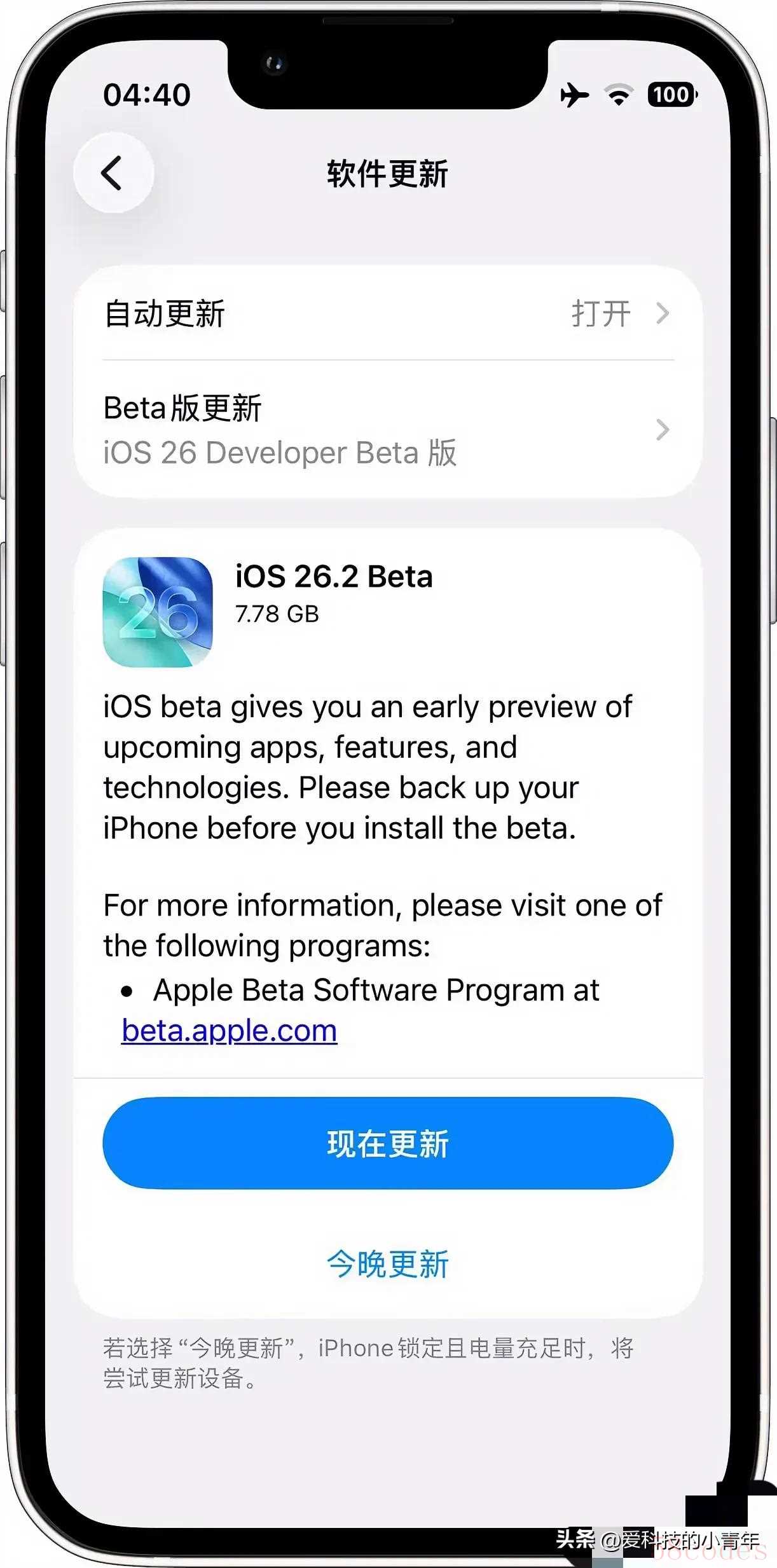 升级包大概8GB,我已经提前清了手机内存,准备等正式版出来看看反馈。身边用iPhone14的同事说无所谓,反正26.1已经挺稳了,新功能有了更好没有也不影响。