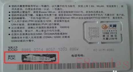 PUK码:当PIN码连续三次输入错误被锁定后,需要用PUK码解锁。PUK码默认会附带在购买SIM卡时候的大卡上面,例如下图的位置: