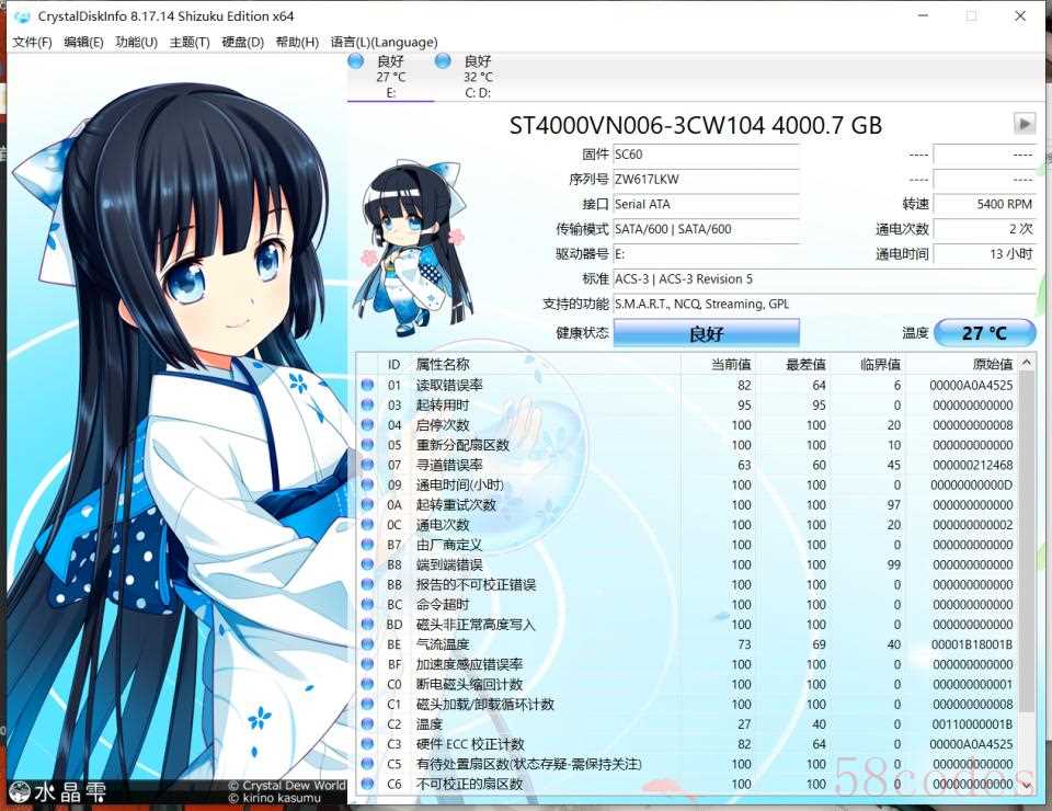 首先通过大家最熟悉的CrystalDiskInfo简单查看下希捷酷狼这块NAS硬盘的基本信息。固件版本SC60,传输模式为SATA/600,转速5400RPM,支持ACS-3标准,支持S.M.A.R.T,NCQ,Streaming,GPL功能,硬盘的整体健康度和待机温度都是不错的。
