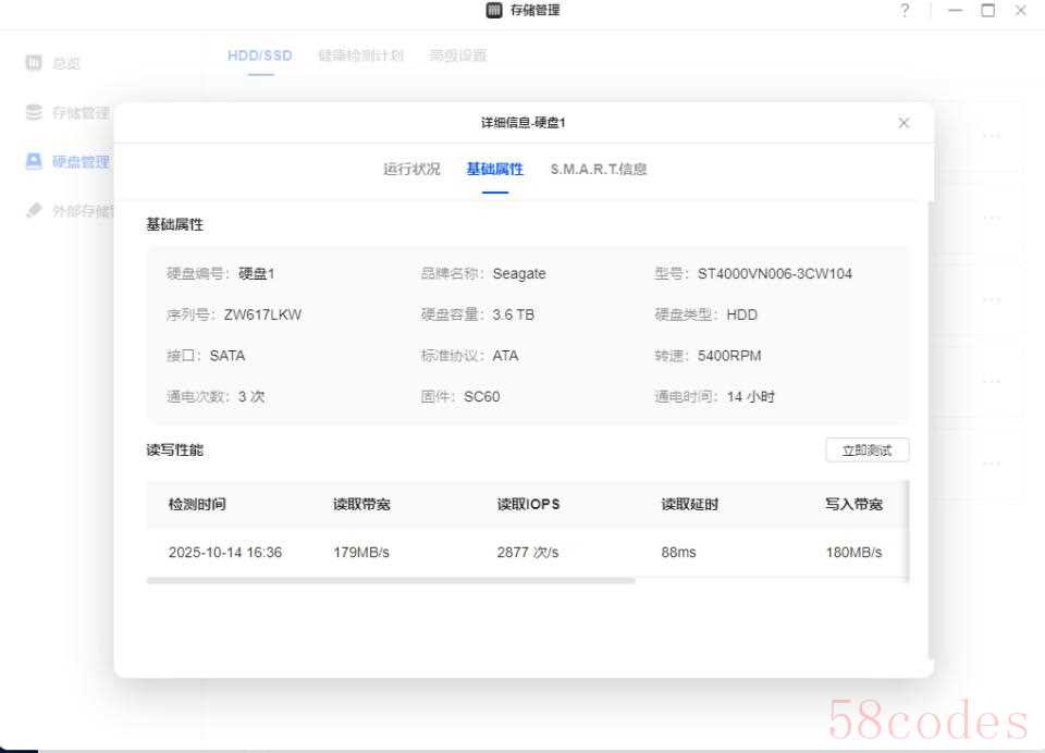 通电开机,在NAS中我们可以看到全部的硬盘都被正确识别,不存在任何兼容性问题。同时在基础信息中还显示了硬盘的各项参数,并且底部还支持读写性能测试。简单测试结果如上图,读取179MB/s,写入180MB/s,延迟都是88ms。