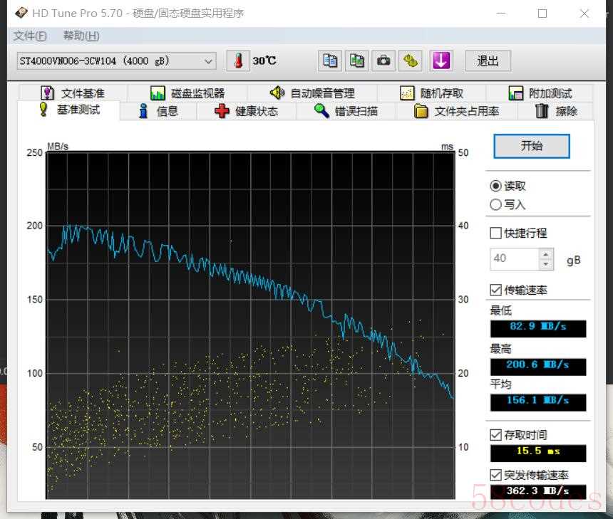 HD Tune Pro这款软件能够体现硬盘在传输大文件时的表现,以传输40GB大型文件测试为例,其整体传输曲线表现如上图,平均速度156.1MB/s,最高速度达到200.6MB/s,整体曲线没有大幅度波动,缓慢下降的趋势符合正常值。