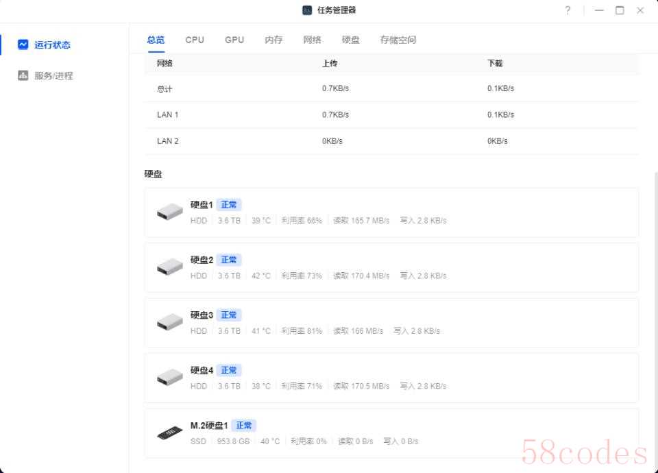绿联和希捷酷狼之间有深度合作,所以酷狼的AgileArray技术也是支持的,简单设置好RAID后,在任务管理器中我们也能看到硬盘的详细运转信息,除了显示硬盘的容量,还显示了硬盘的温度、利用率和实时读写速度。