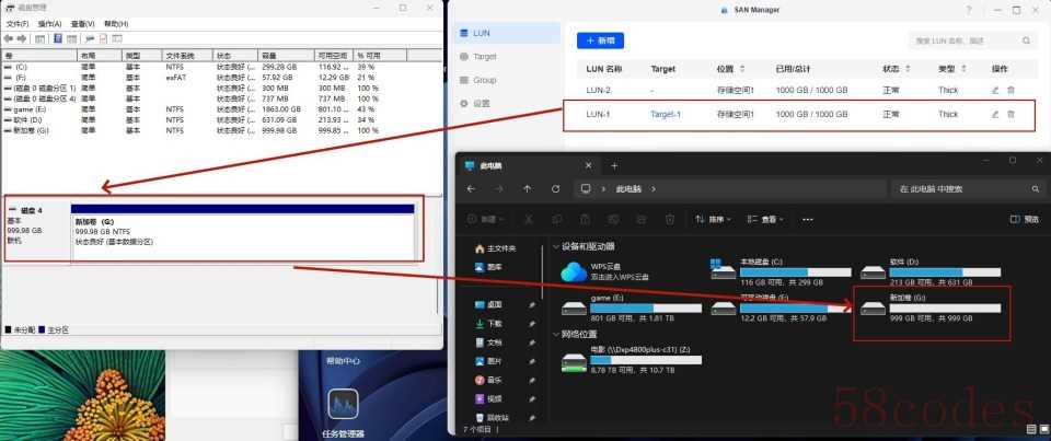 另外,最新的绿联UGOS Pro系统还支持把硬盘通过iscsi协议挂载在电脑上,SMB是把整个NAS挂载在电脑上,而iscsi协议则是把NAS中的一块存储空间“变成”电脑中的一块新硬盘显示在本地电脑中,只要网速够快,这个“硬盘”的延迟极低,性能也直逼电脑中内置的机械硬盘。