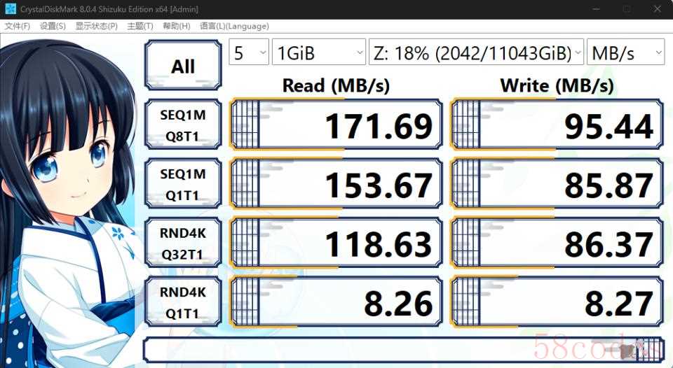 以iscsi协议挂载的希捷酷狼NAS硬盘可以在CryDiskMark上被正确识别成硬盘,这里我也进行了读写速度测试,就结果而言其相较于SMB挂载速度稍微快了一点,但提升不大,由此可见希捷酷狼NAS硬盘不管是在SMB还是iscsi协议下速度基本上都是跑满的。