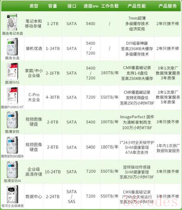 希捷的硬盘分类有酷鱼、酷狼、酷鹰和银河等系列,其中酷鱼是普通盘适用于PC装机,酷狼和酷狼PRO是NAS专用盘,PRO品质更高,当然价格也更贵;酷鹰针对视频图像;银河是企业存储盘,价格是最贵的。