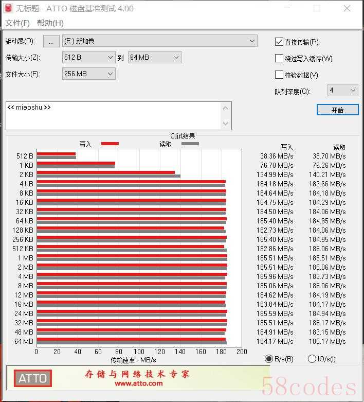 在读写稳定性测试上,以ATTO磁盘基准测试为准,结果如上图,在文件大于4KB后,速度稳定在185MB/s左右,一般硬盘多在8-16KB,希捷这个4KB着实震惊了我,确实够稳。