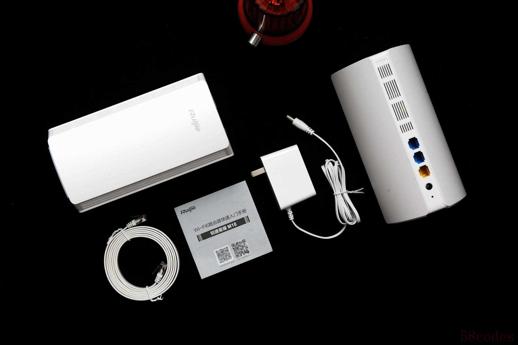 单个产品退去包装后能够看到,锐捷星耀 M18主机一台,千兆面条网线一根,说明书一份,标准路由器圆头电源适配器一个。