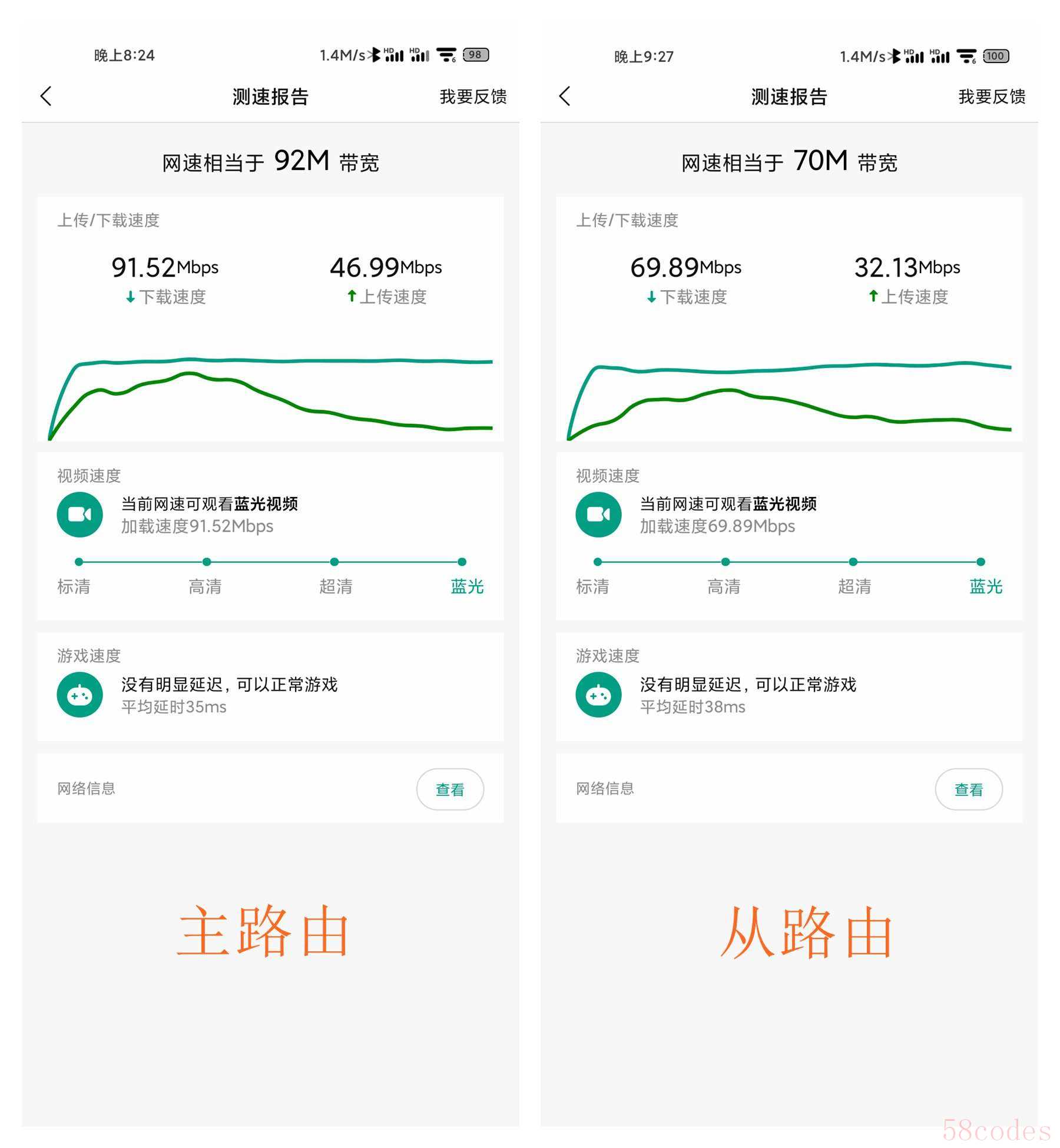 首先是对下载速率的一个衰减做一个实测,因为有了三堵墙的阻隔,主路由和从路由之间的信号连接在APP上看是“良好”的状态,实测主路由的实际速度为91.52/46.99Mbps,相当于90M宽带,而从路由的话速度为69.89/32.13Mbps,相当于70M兆的宽带;实测这个效果非常不错了,我用电力猫的速度主路由是100兆,同样位置到从路由只有40兆了。没对比就没有伤害呀。