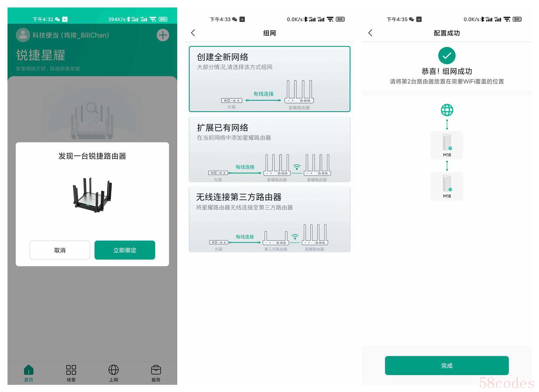 使用锐捷星耀 M18之前,我们首先下载一个锐捷星耀APP,打开APP能够很快速地找到初始化的路由器网络,连接网络后就能够对快速识别路由器并进行路由器设置了,我这里是一主一从的Mesh模式搭配,现将主路由连接网线之后,再添加一个从路由配对组网。当然也完全可以将两个M18放在一起,长按主路由“易联”按键直接实现Mesh组网。