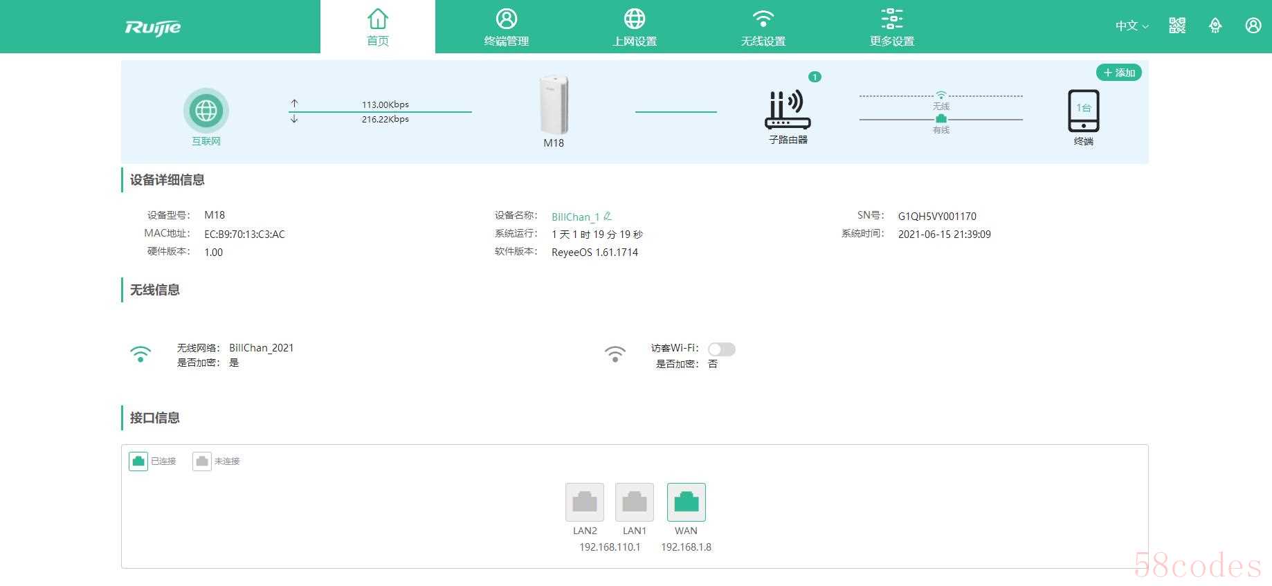 同样,锐捷星耀M18 不仅支持手机APP还支持网页版的管理中心,不需要输入地址码,也不需要输入密码,在手机端可以直接开启“远程EWEB”模式,复制链接直接可以打开设备的远程信息查看。界面非常清爽简单。