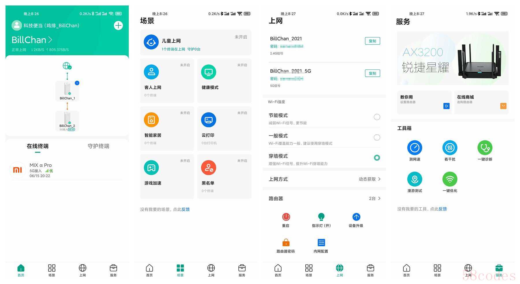 组网成功后,进入APP主页能够看到四个板块,首页板块直接能够看到组网状态和在线终端设备。在场景板块里面集成了一些常用的工具,如访客网络,健康模式,智能家居网络,云打印机,游戏加速以及黑名单,大家可以根据需要自行选择。在上网板块,这里面就是对网络状态的一个设置和固件升级了。在服务板块里面集成了一些常用的测试工具,不仅可以对锐捷家的设备进行测试,对第三方网络测试也是非常友好的。