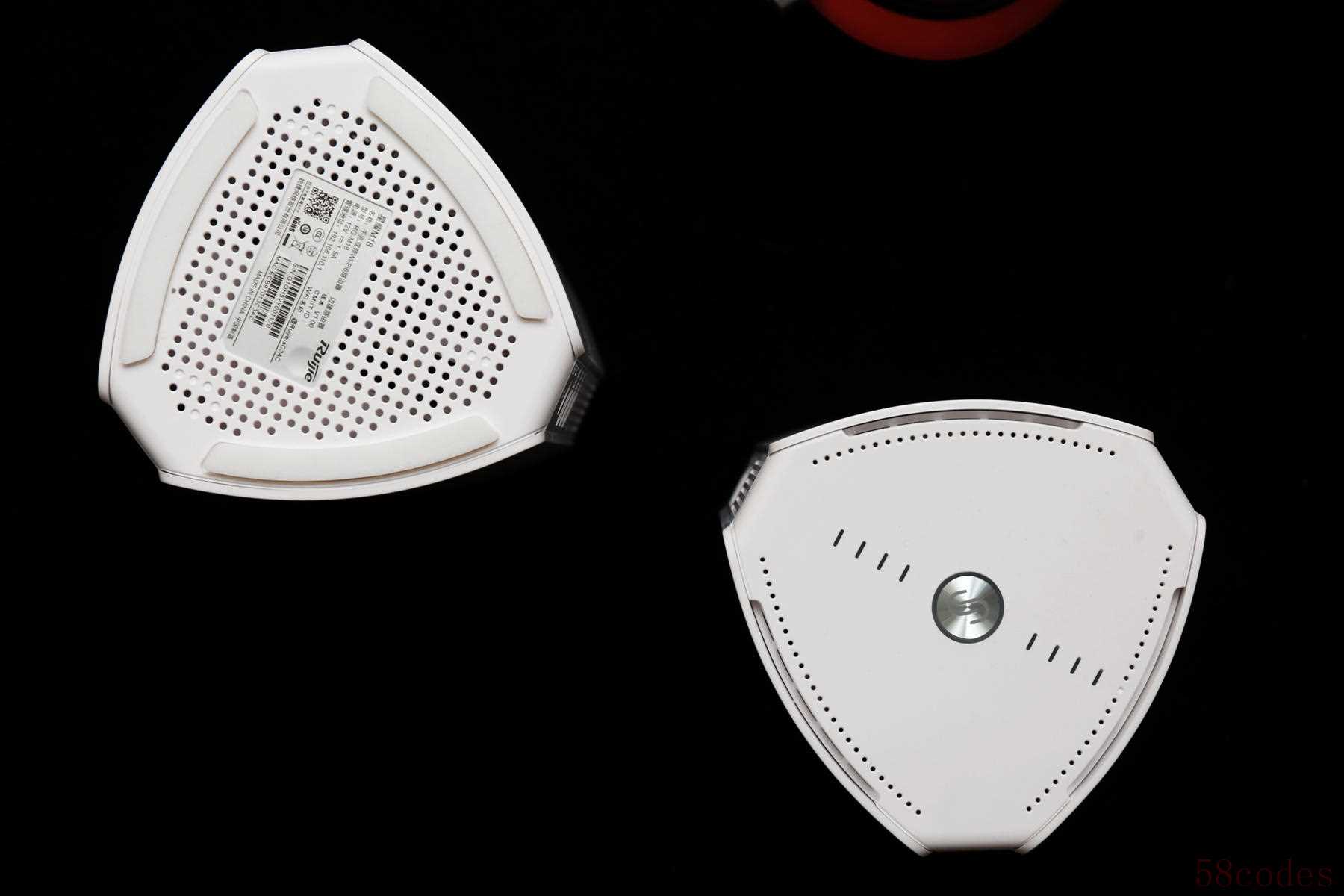 外观方面,锐捷星耀 M18 的外观设计还是比较讲究,俯瞰外观设计有点像转子发动机中的“转子”部分,不过锐捷星耀 M18显然更加注重细节修饰,在三条边上做了直角边设计,并分别做了大量网孔散热设计,在背面底部还摆放了两个LAN接口,一个WAN接口和电源接口以及复位孔,在顶部还设计了一个“易联”按键和上下各一排指示灯,在顶部边缘和整个底部都开了很多小小的散热孔。