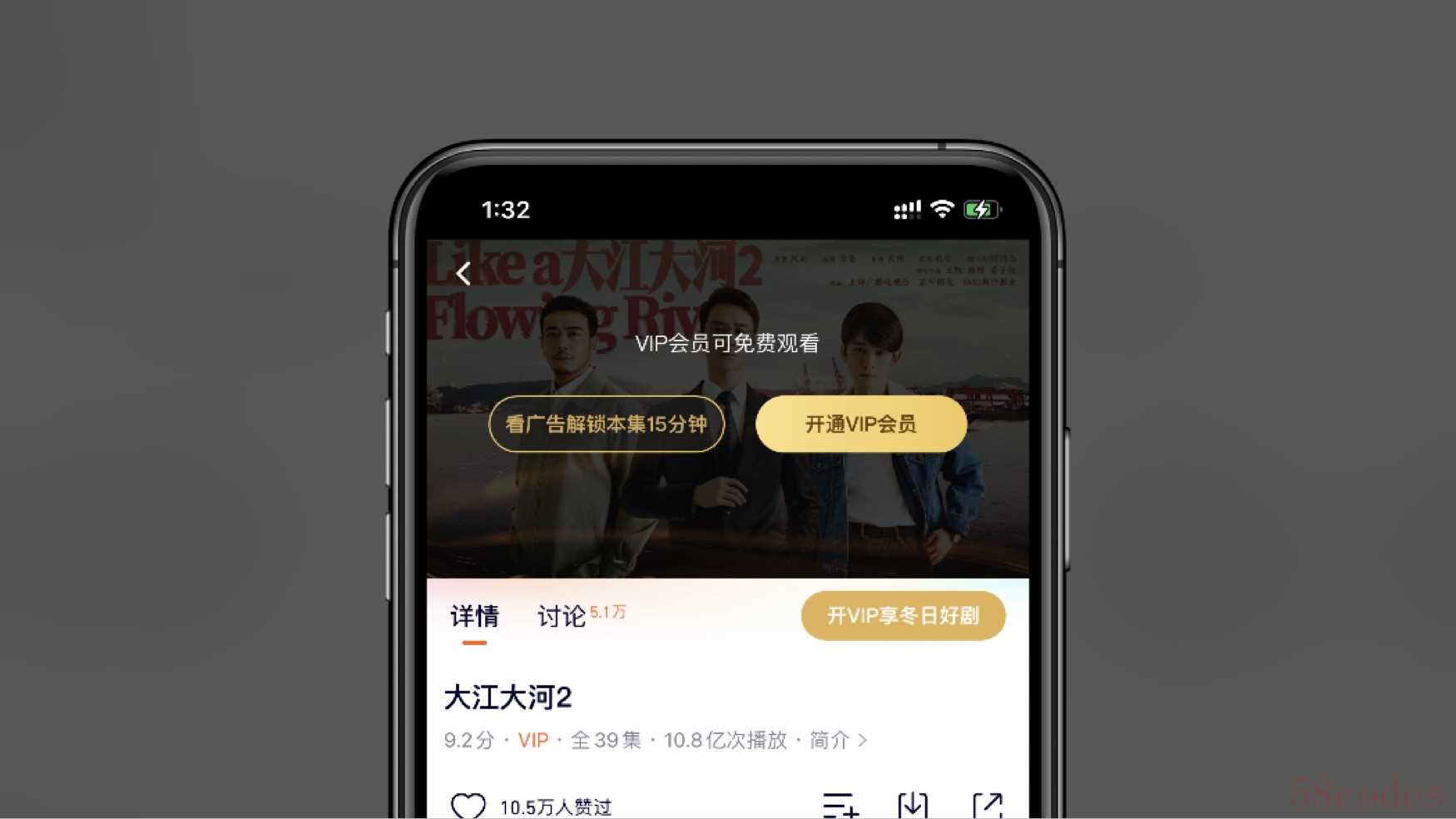 腾讯视频上的“受限会员”模式采用分段看广告方案(手机端可用),每看一段广告可解锁15分钟的观看时间。以在其他平台需VIP观看的电视剧《大江大河2》为例,一集45分钟需观看3段广告,分段广告的时长不同,会在15秒、5秒和10秒里随机切换。并且在看广告后用户能开启会员专属的高清“臻彩视听”模式。