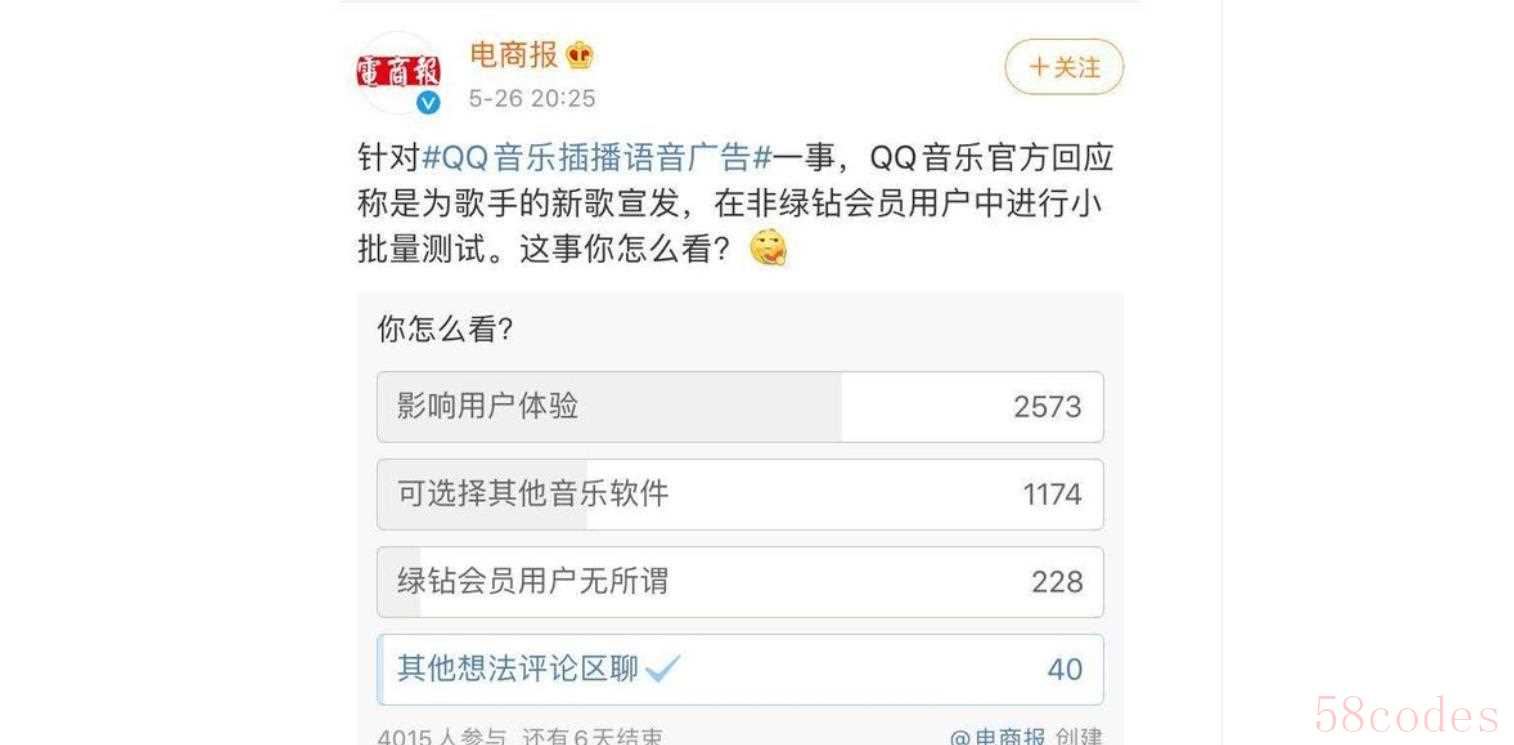 QQ音乐曾在2020年5月小范围测试过插播广告方案,但消息一出立即引起了许多网友的吐槽。在电商报发起的一项相关调查中,选择“影响用户体验”和“可选择其他音乐软件”的用户占比达到93.3%,说明插播广告方案可能在国内市场行不通,除非QQ音乐和Spotify一样选择给予免费用户更多福利,如更丰富的免费曲库和更简洁的软件界面。