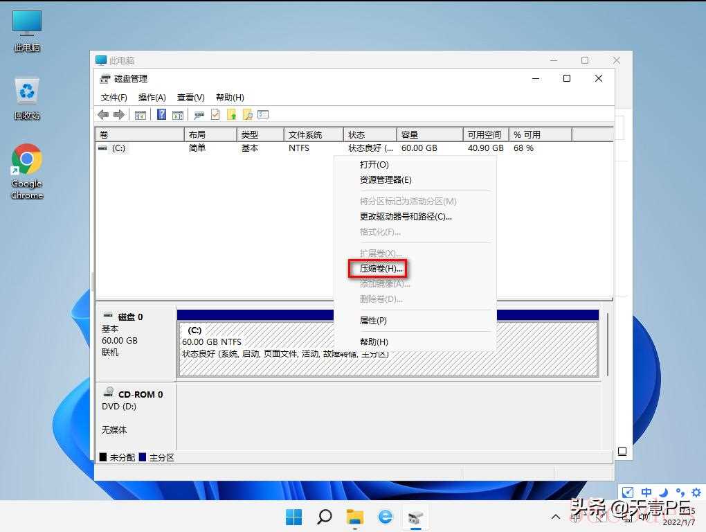 - 在磁盘管理窗口中,找到C盘,右键点击它,然后选择“压缩卷”。