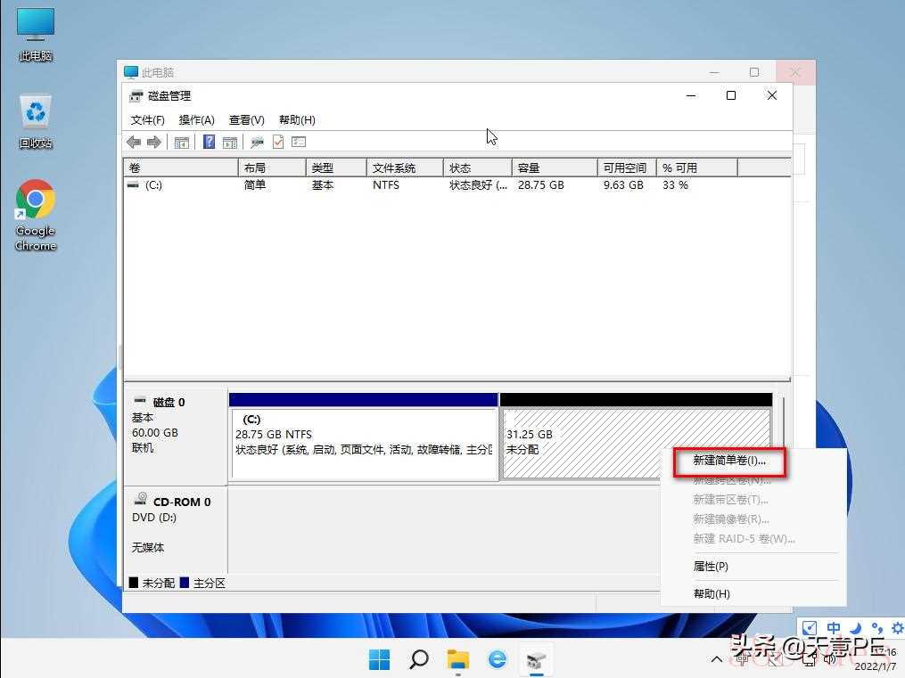 - 压缩完成后,你会看到一个未分配的空间。右键点击这个未分配的空间,然后选择“新建简单卷”。