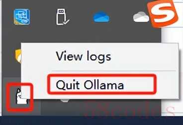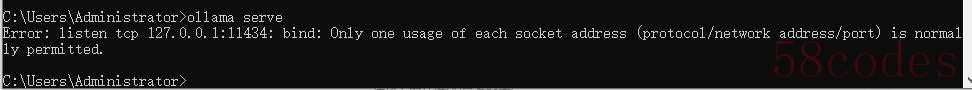 10、测试插件,在CDM窗口输入ollama serve回车,查看运行提示,如果出现Error: listen tcp 127.0.0.1:11434: bind: Only one usage of each socket address (protocol/network address/port) is normally permitted.提示则为ollama图标没有退出,我们点击右下角,看下隐藏的程序有没有ollama,有的话右键选择退出(像小羊一样的图标)。